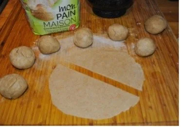 With each ball make a thin pancake shape with a rolling pin. Dust with flour to make this easier.