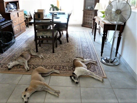 Here are a couple more photos, can't let you have any of the dogs in the pool - they don't like the water ! They are happiest lying under the fans in the coolest of our rooms, but they do sunbathe as the sun goes down! They are very sensible !